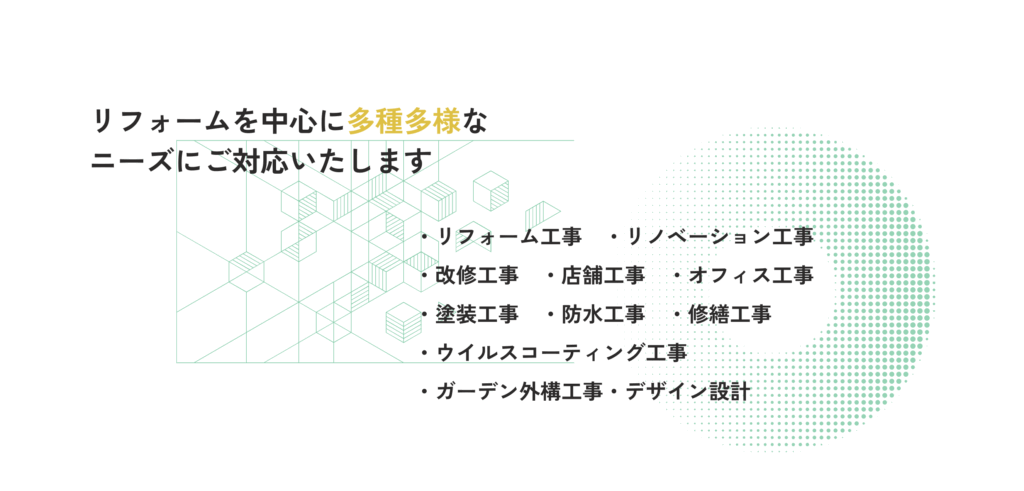 | 事業内容 | ・塗装工事 ・防水工事 ・修繕工事 ・改修工事 ・店舗工事 ・リノベーション工事 ・リフォーム工事 ・オフィス工事 ・ガーデン外構工事/デザイン設計 ・ウイルスコーティング工事 |